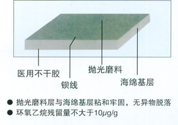 清潔片是由海棉基層、含SIO醫(yī)用膠體拋光磨料及背襯的醫(yī)用不干膠組成。根據(jù)特殊要求,背襯中可帶一條不透X光的鋇線。